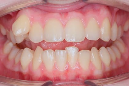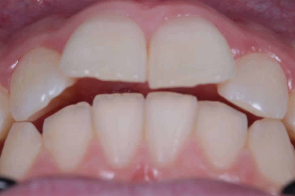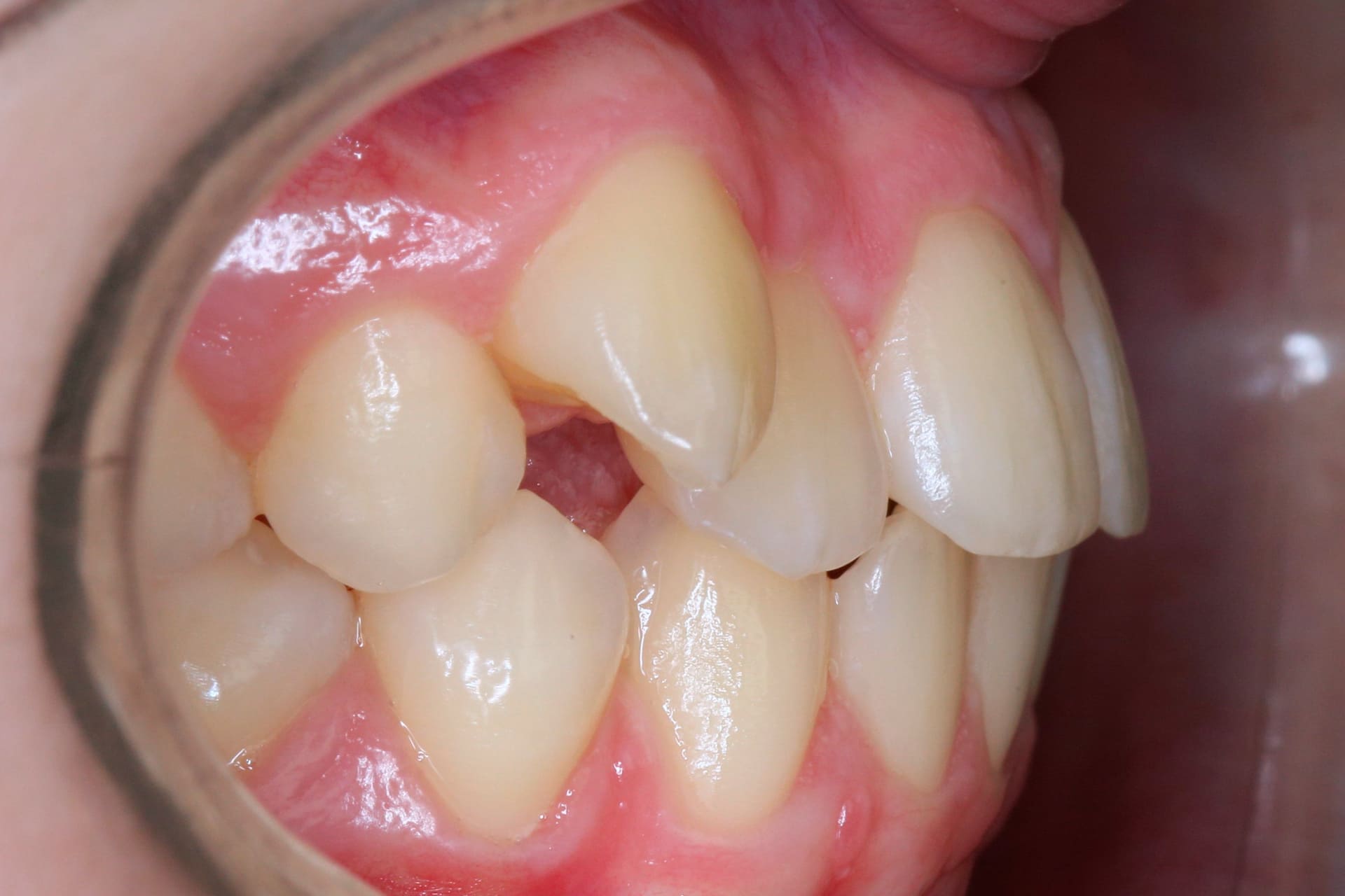 Девушка в подростковом возрасте стесняется своей улыбки из-за торчащего из зубного ряда зуба, скромно улыбается и старается прятать зубы при разговоре. После осмотра и диагностики нашей командой принято решение о лечении на элайнерах. Перед началом лечения проведено лечение всех кариозных зубов и замена несостоятельных пломб. Изготовлен комплект элайнеров и установлены аттачменты.