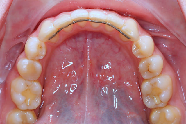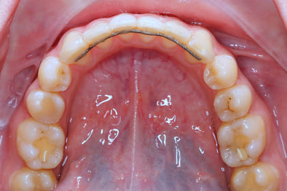 После того как зубы перемещены в нужное положение, лечение завершается. Начинается ретенционный период — время после активного лечения, когда используются ретейнеры для поддержания зубов в новом положении. В качестве удерживающего устройства используют тонкую металлическую проволоку, которую крепят на внутреннюю поверхность зубов, или прозрачную капу, напоминающую элайнер.