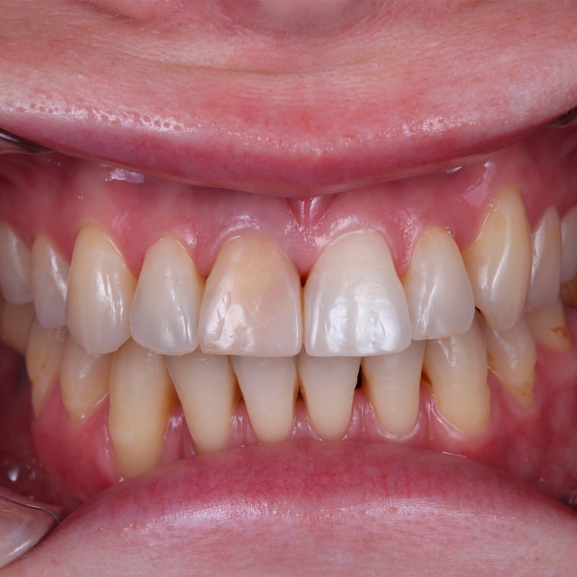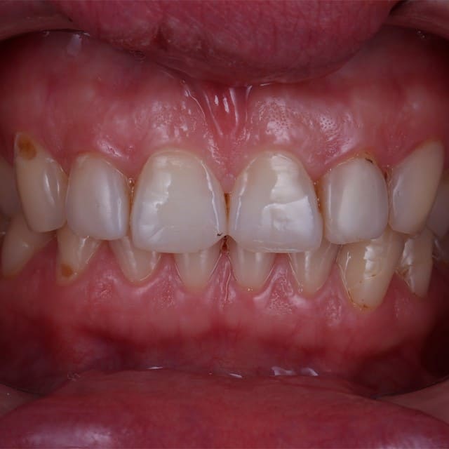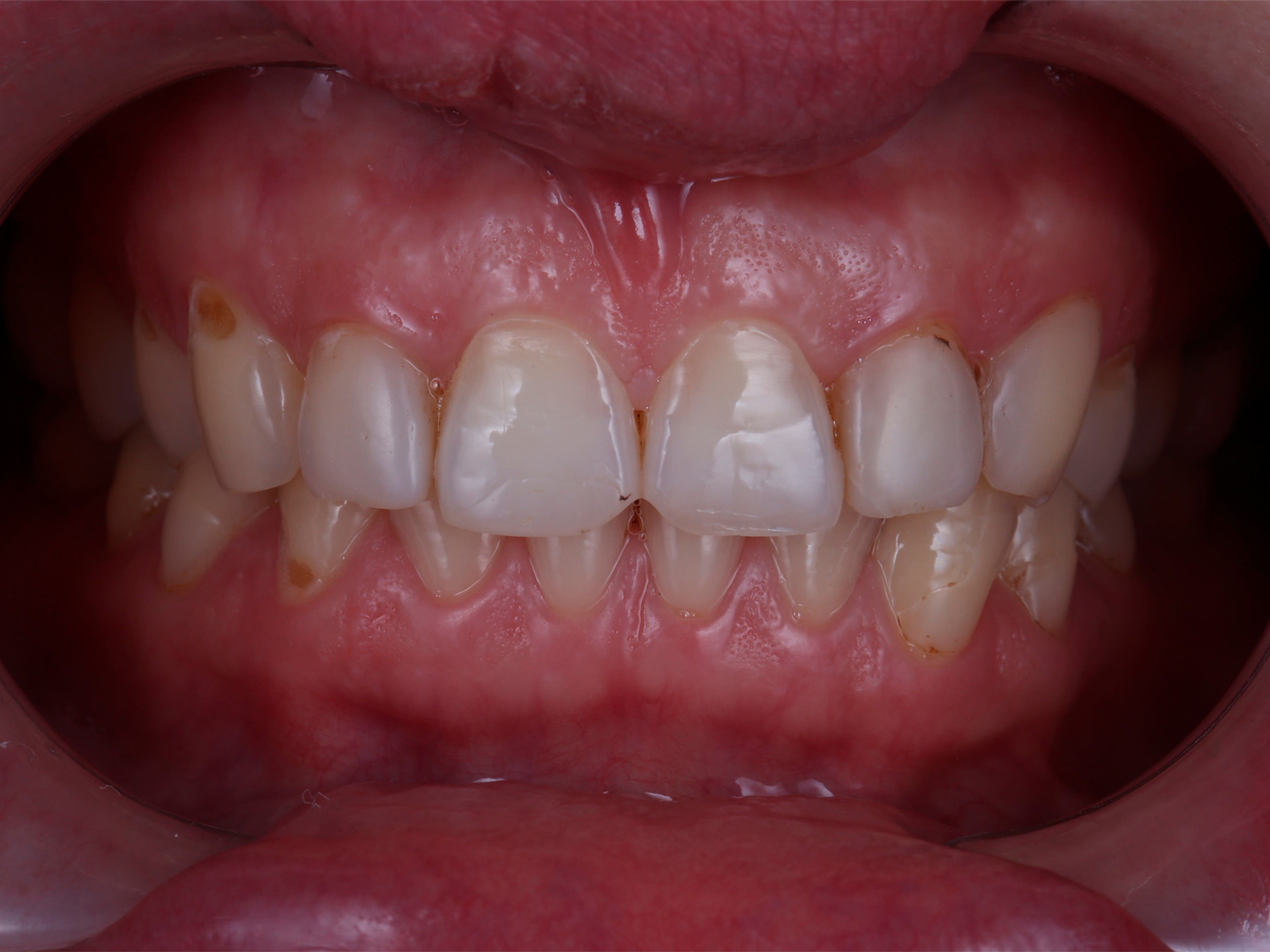 Общая неудовлетворительная эстетика улыбки, скрежет зубов.
