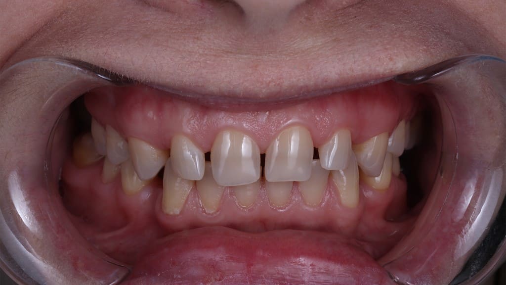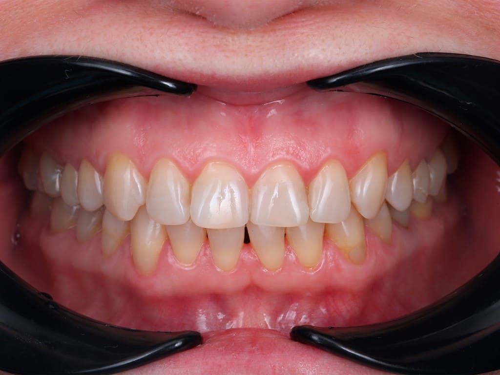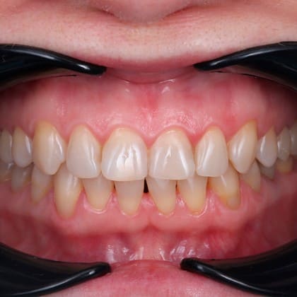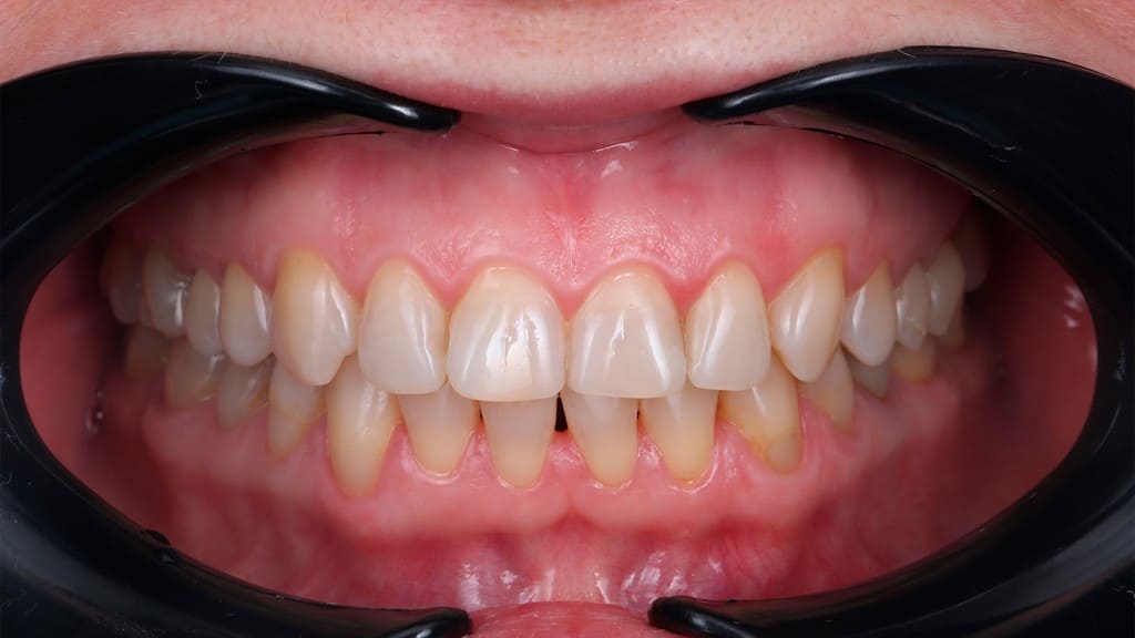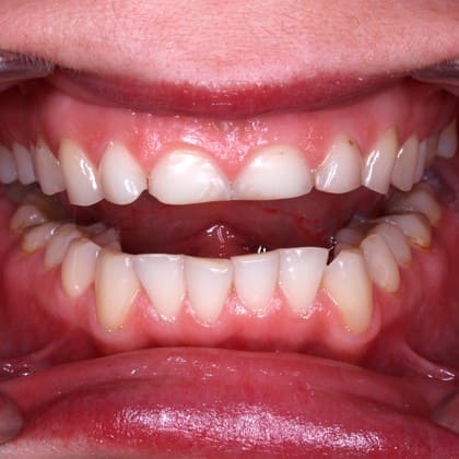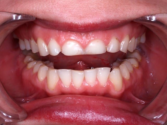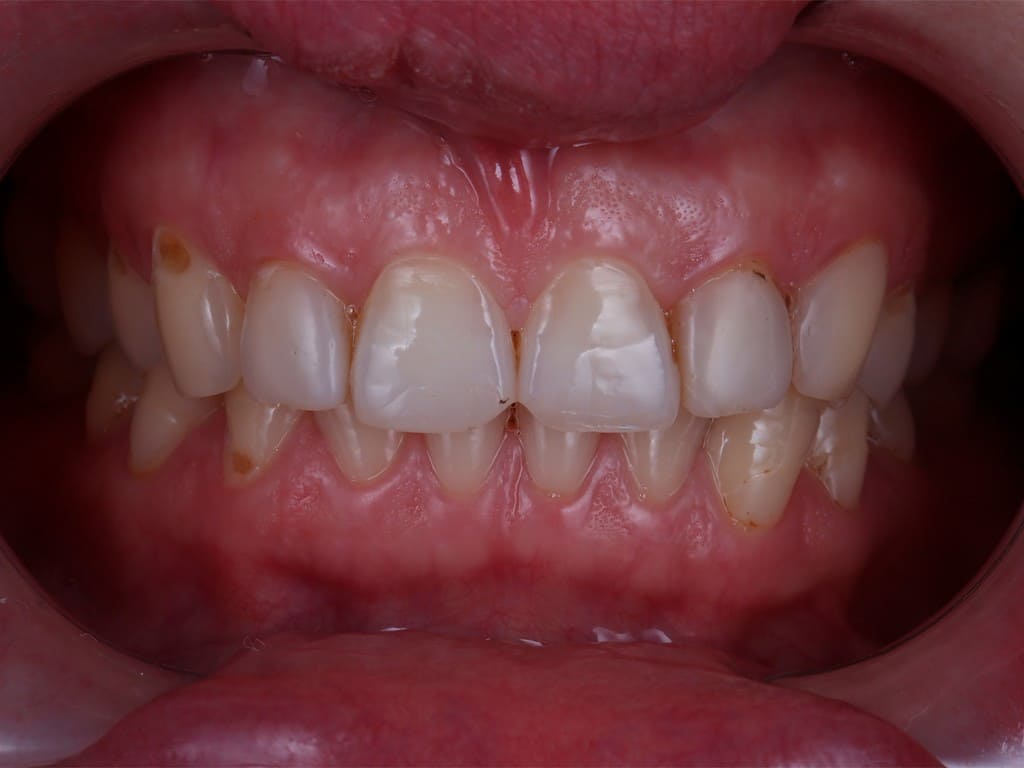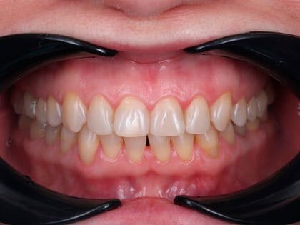 К нам обратилась молодая девушка с патологической стираемостью зубов. Передние зубы потеряли треть своей длины из-за бруксизма.