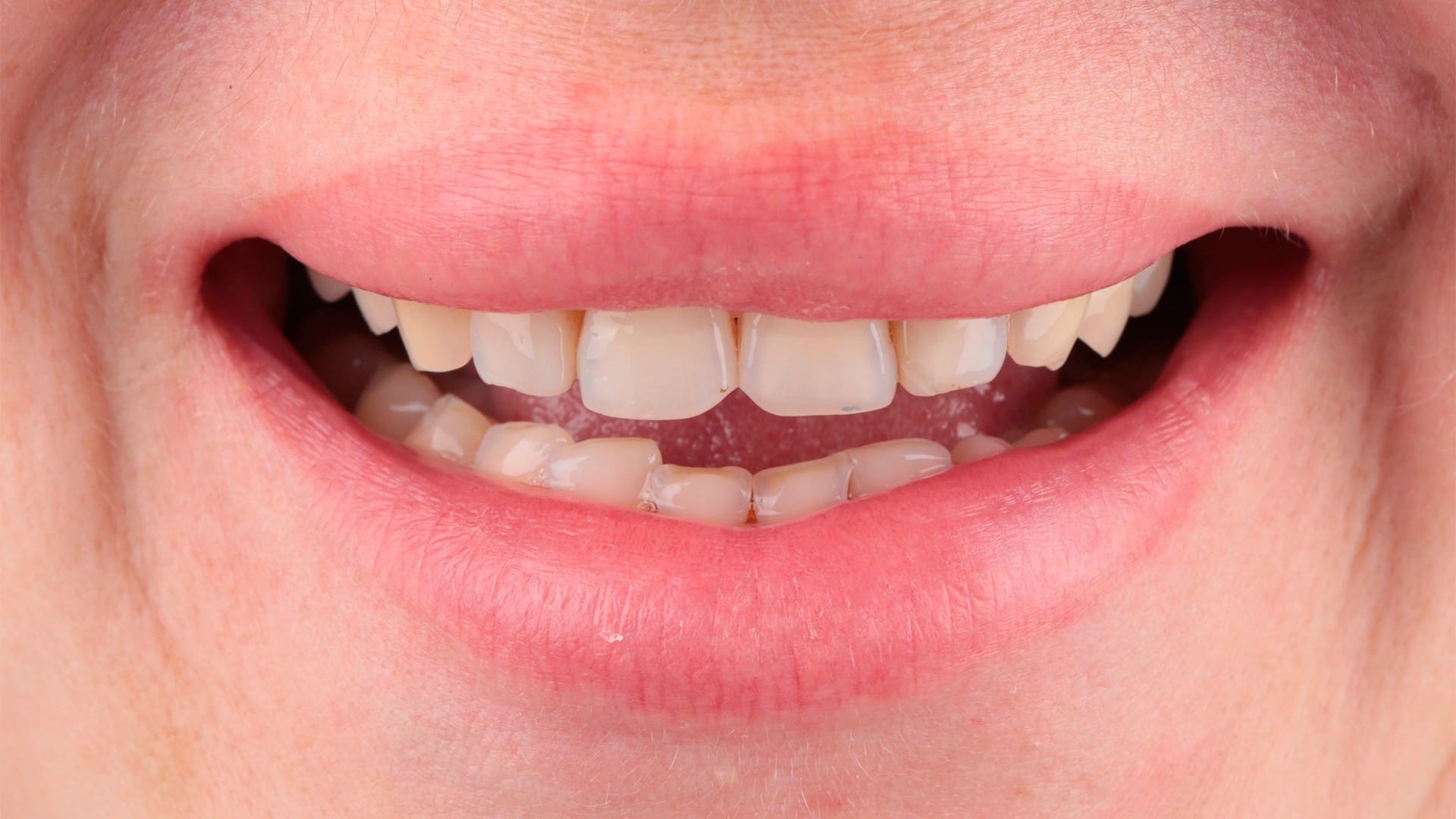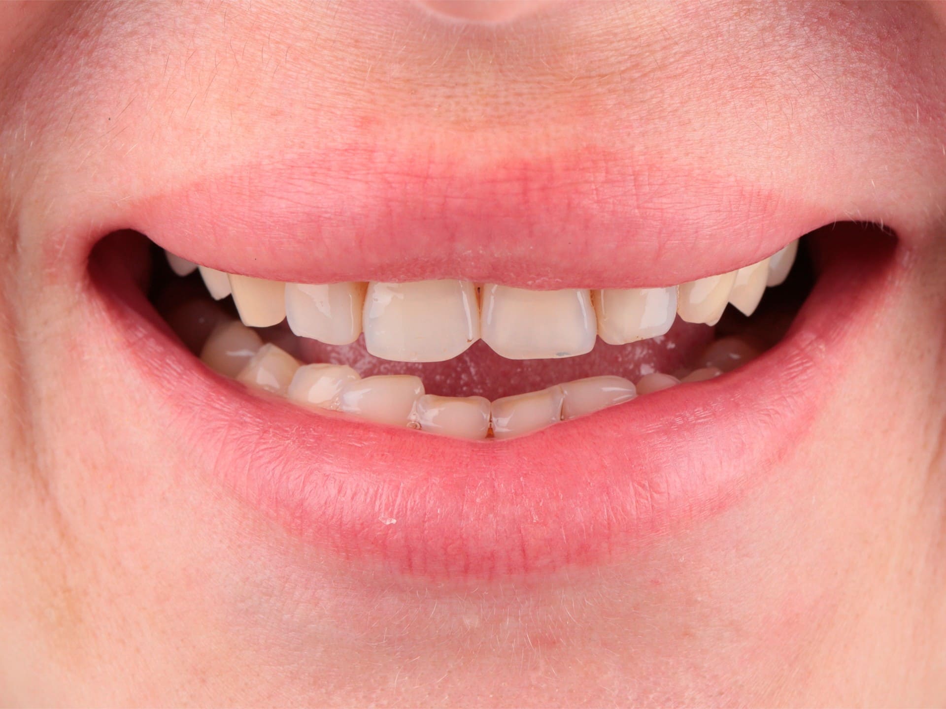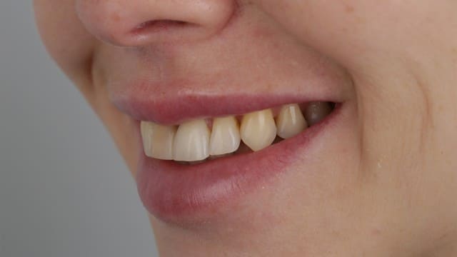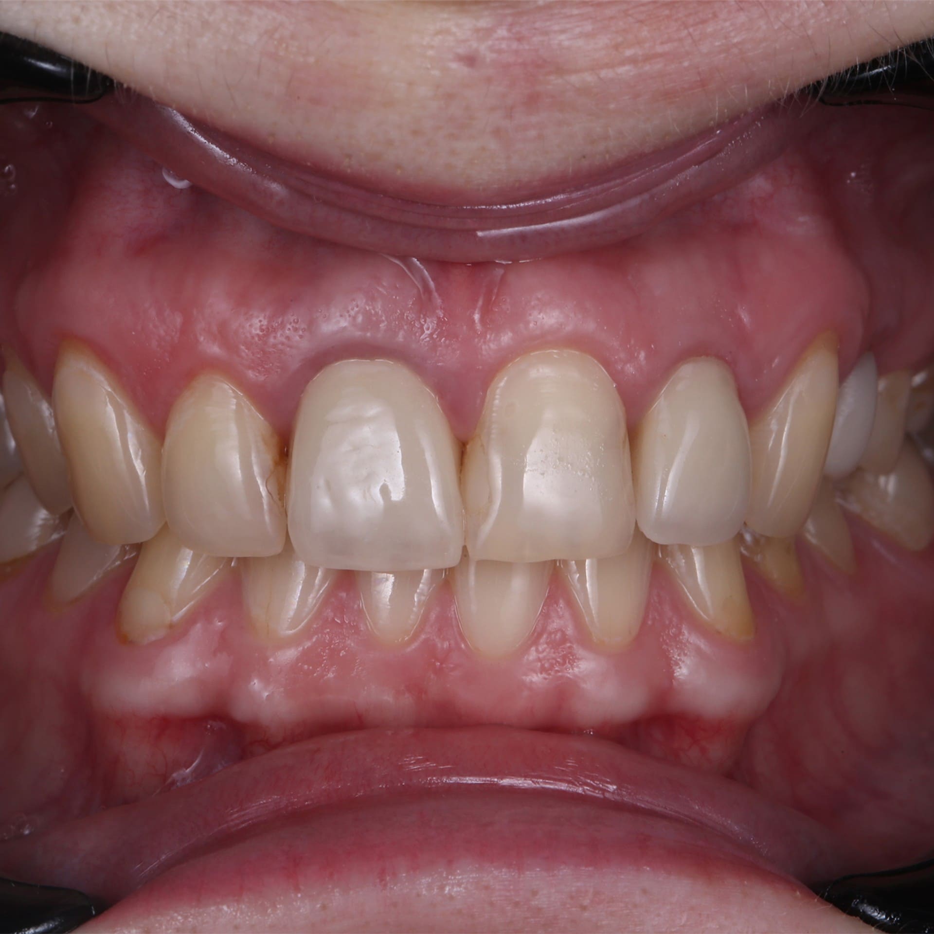 К нам обратилась молодая девушка с патологической стираемостью зубов. Передние зубы потеряли треть своей длины из-за бруксизма.
