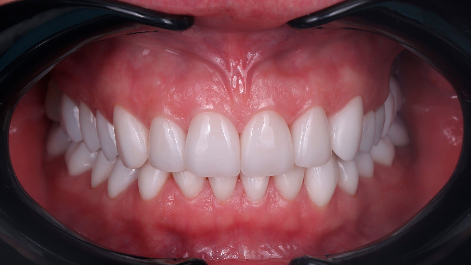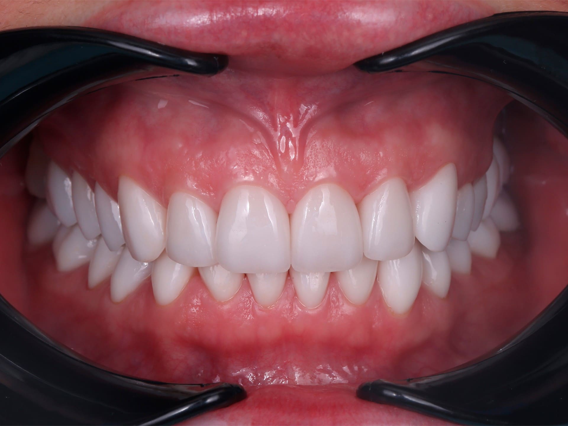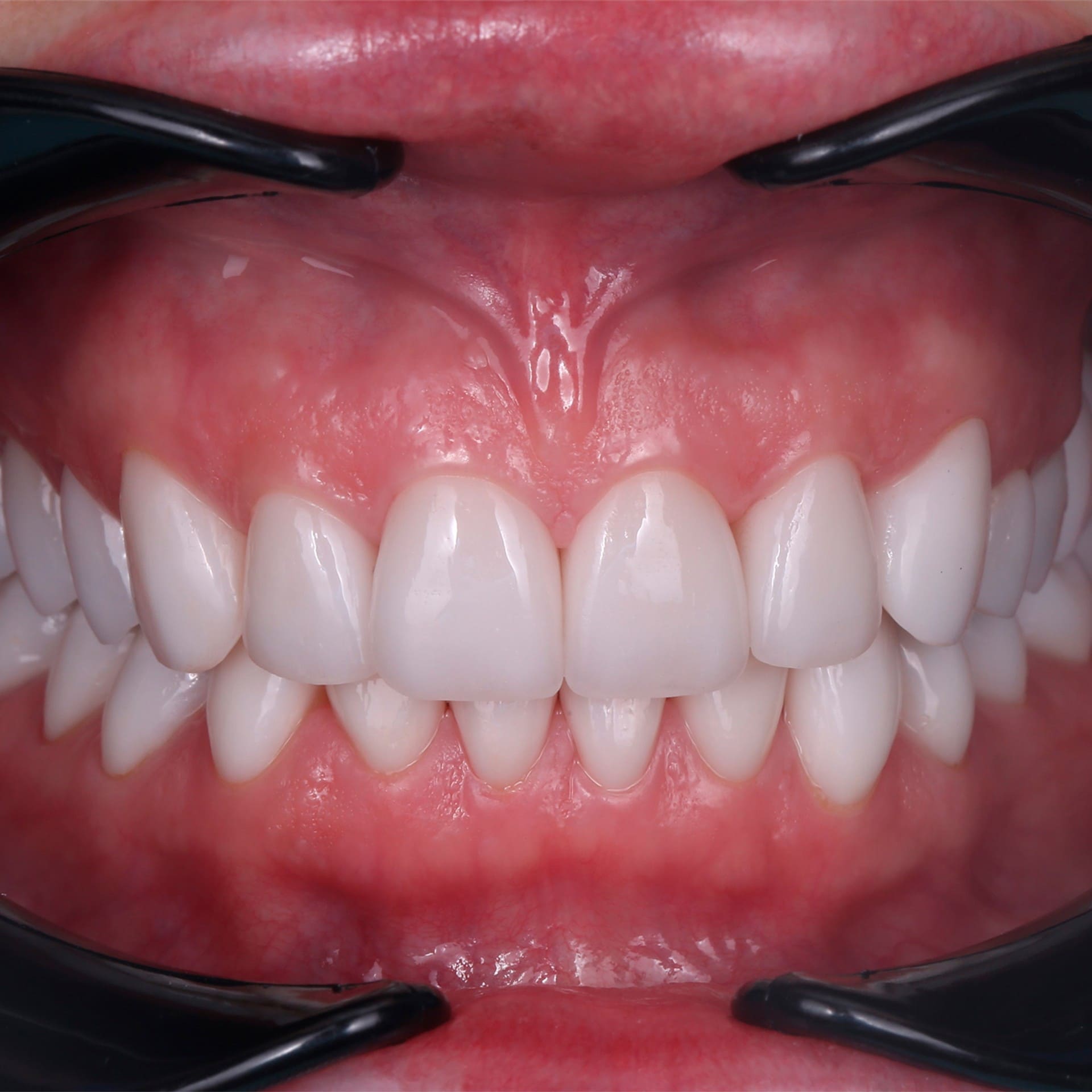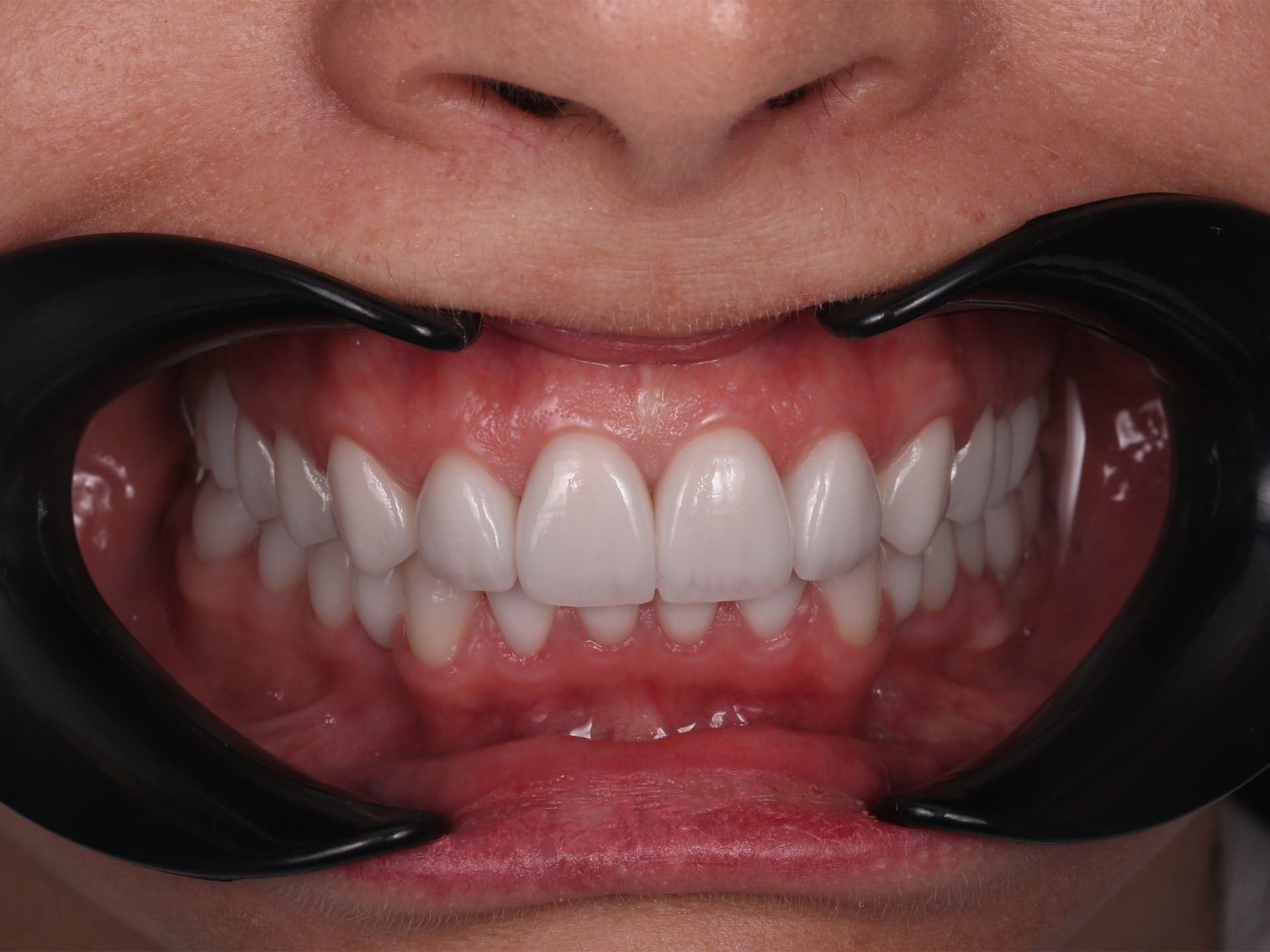 - Стоматолог ортопед при помощи специального оборудования - лицевой дуги - спланировал гармоничное расположение передних зубов.