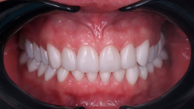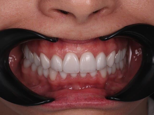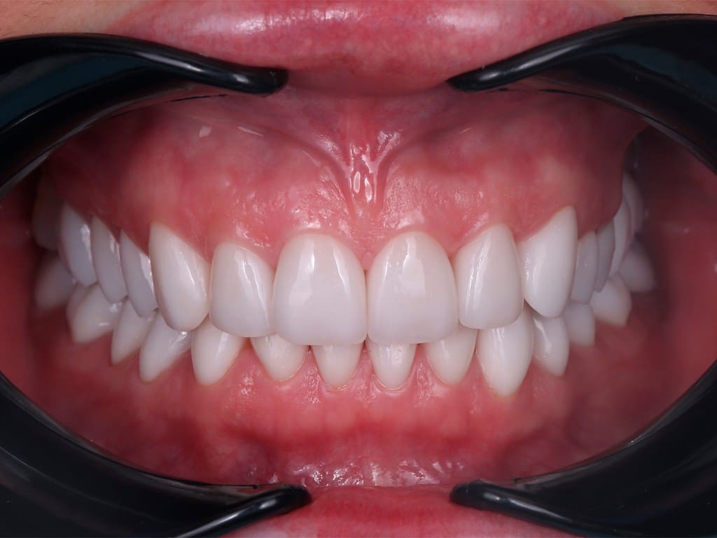- После осмотра и анализа снимка КТ мы предложили пациентке вернуть утерянную высоту прикуса, установить керамические виниры в зоне улыбки и покрыть коронками жевательные зубы для распределения нагрузки.