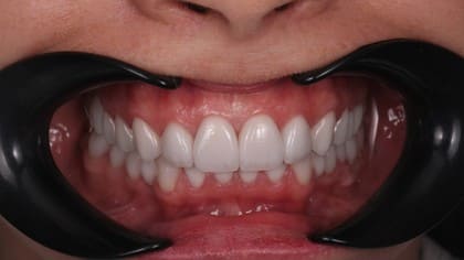 - Стоматолог ортопед при помощи лицевой дуги спланировал гармоничное расположение передних зубов.